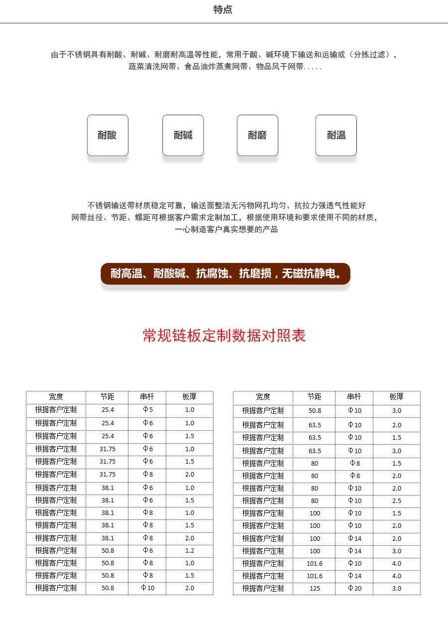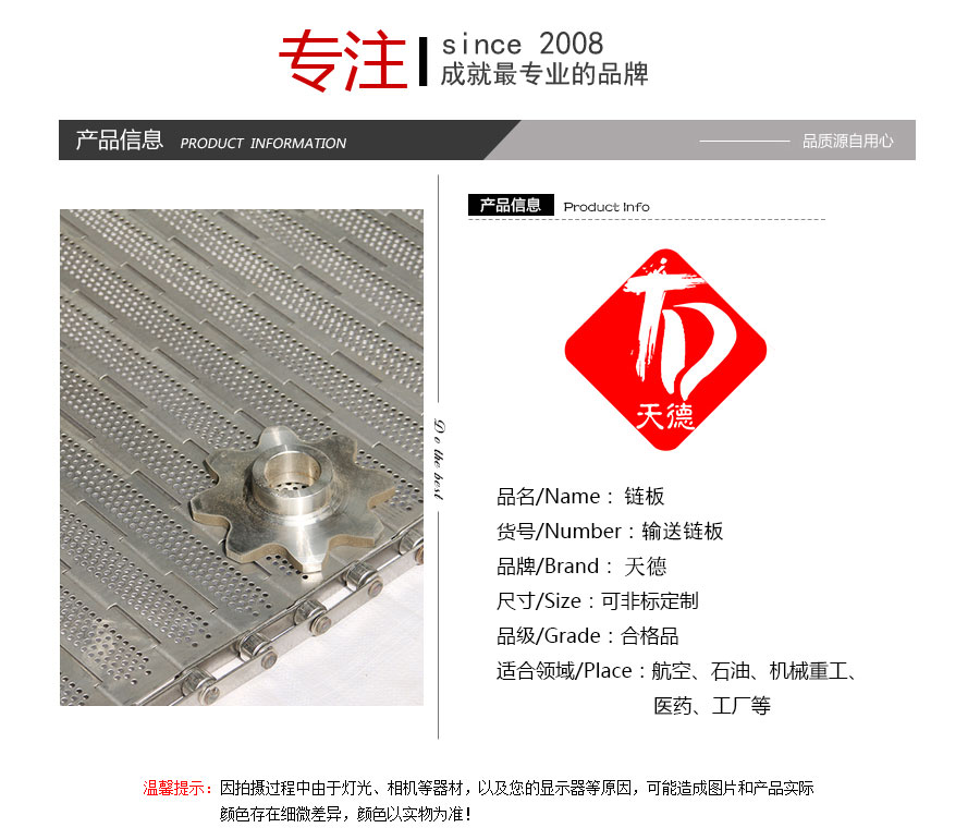 天德溫馨提示:輸送鏈板是定制產(chǎn)品,規(guī)格及報(bào)價(jià)會(huì)根據(jù)板厚、節(jié)距、串桿直徑、材質(zhì)、寬度、長度來計(jì)算,親 也可以告訴我們使用要求、應(yīng)用環(huán)境、每米載重量,由我們來幫您推薦定制數(shù)據(jù),盡力做到定制的產(chǎn)品即夠用也不浪費(fèi)。