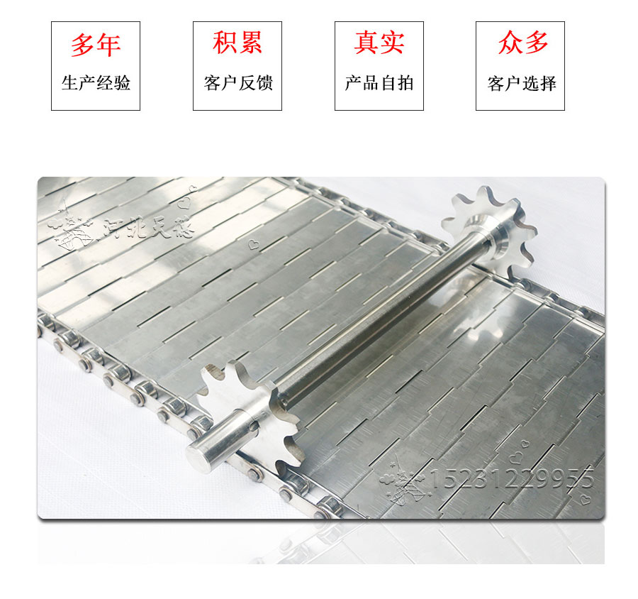 Iron plate conveyor belt is very strong, made by iron plate and chains, it's driven by chain. this belt suit to the small size and high density object's conveyoring, it's running steady, easily install and change, long serviceand high cost. usually used for middle and heavy weight's conveyor. iron steel sheet bended into hinges, use the support shaft combine the hinges and chains together. The ends of the chain can be used to fix the washer or cotter pin, cotter pin use convenient disassembly, convenient maintenance.