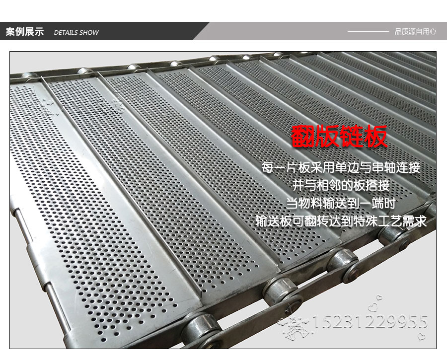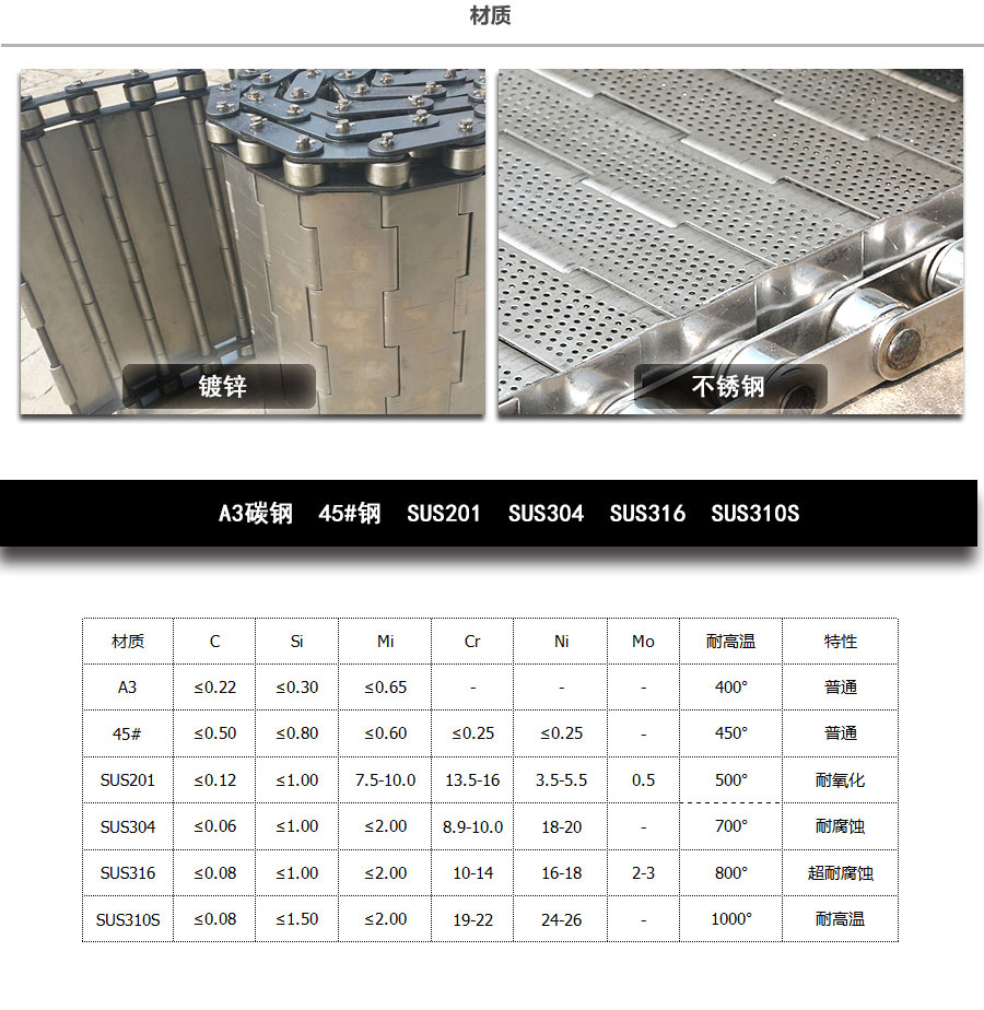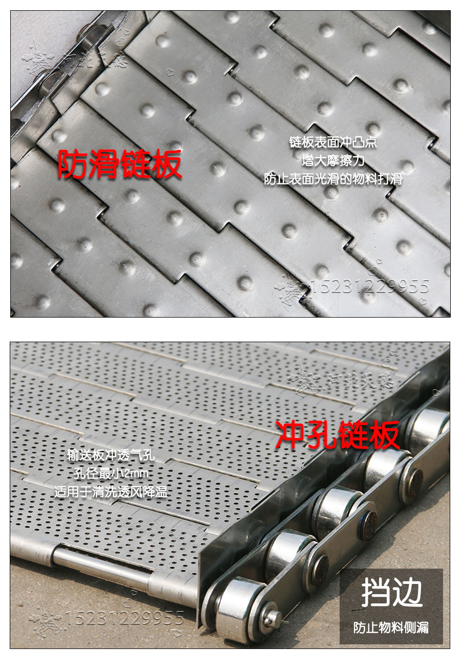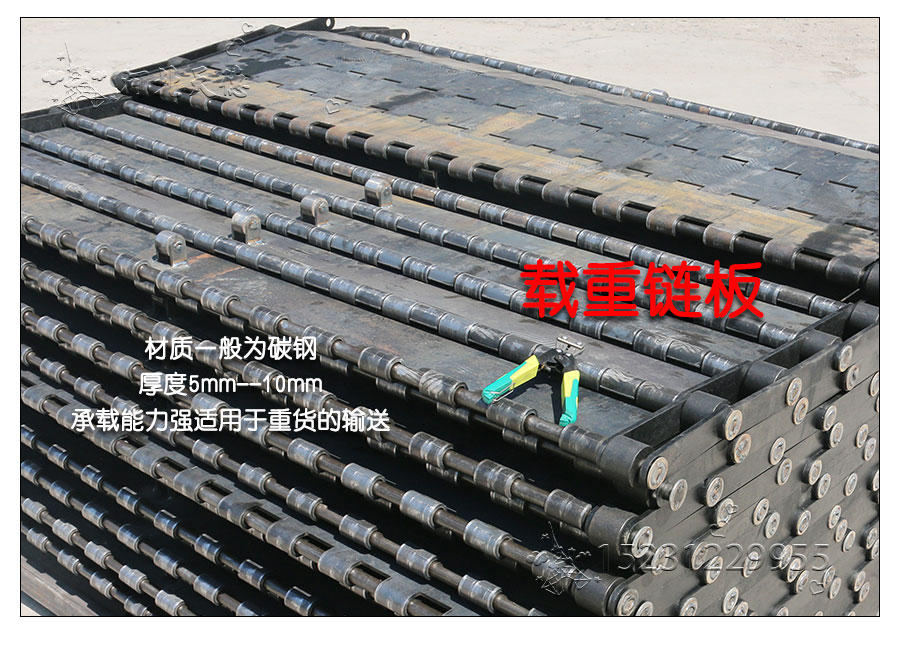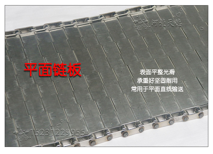 輸送鏈板非常堅(jiān)固由鏈條驅(qū)動(dòng)采用金屬板材生產(chǎn),適合用于輸送細(xì)小的高密度物件,輸送過程中運(yùn)轉(zhuǎn)平穩(wěn)安裝更換方便,成本相對(duì)較高使用壽命較長用于中等和大負(fù)荷輸送。鋼板彎曲形成合葉,使用支軸將合葉和鏈條串在一起。兩端的鏈條可以使用開口銷或者墊圈來固定,使用開口銷方便拆卸,維護(hù)方便。