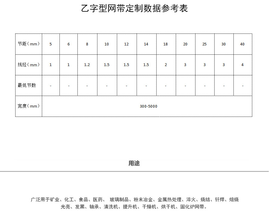 乙字網(wǎng)帶:又稱梯形網(wǎng)帶或一字網(wǎng),此網(wǎng)帶通常系齒輪傳遞網(wǎng)帶,具有透氣性好的優(yōu)點(diǎn),拉力均勻,做工精細(xì),此網(wǎng)帶具有轉(zhuǎn)動(dòng)靈活、平穩(wěn)性好、耐高溫、耐壓力、耐腐蝕、壽命 長等特點(diǎn)。主要用于餅干機(jī)圖層,輕物品輸送及電子回流焊等